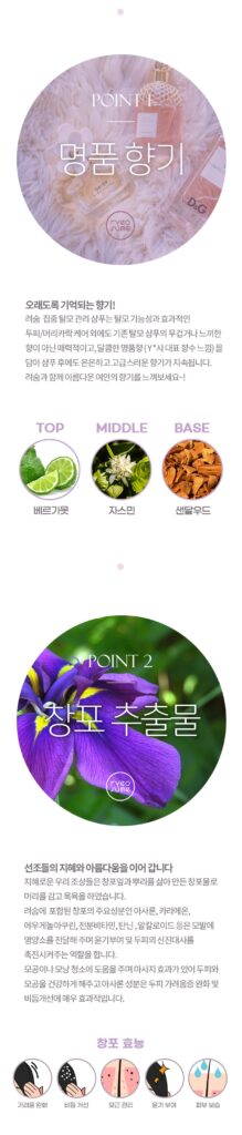탈모 전문 샴푸의 고급스럽고 부드러운 느낌을 최대한 살려 디자인 하였습니다. (제품 직접 촬영)